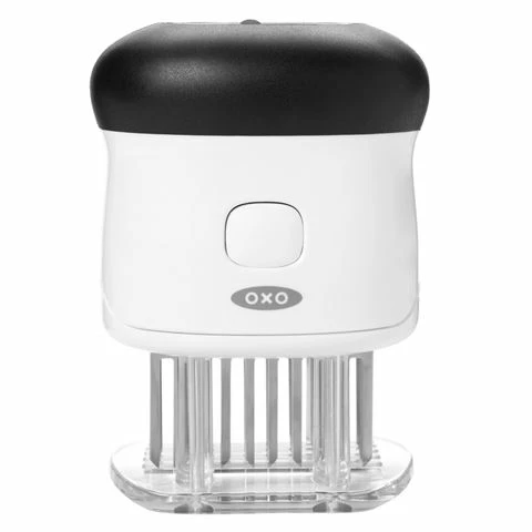 With 50 sharp blades, not only does the Bladed Meat Tenderizer make meat more succulently soft, it also creates pockets for meat to quickly absorb marinades and retain its own juices, promoting uniform cooking. The clear base makes it easy to see the indent left in the meat for even tenderization and the contoured shape is comfortable to hold.