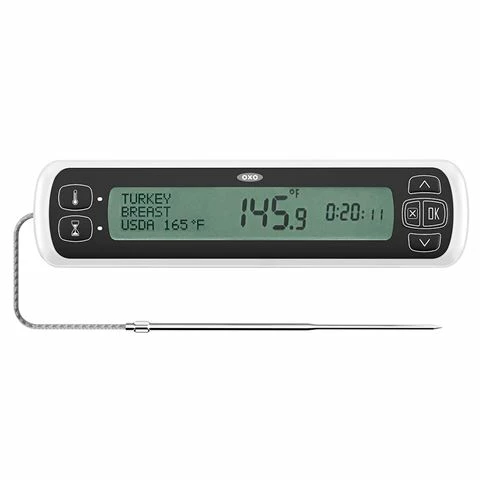 - Provides accurate measurements (in °F and °C) while meat is being cooked
