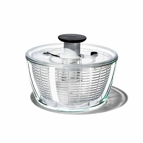 The Oxo Good Grips Glass Salad Spinner has it all. It’s the effortless way to dry greens and herbs at the touch of the soft, non-slip knob. The spinning basket doubles as a colander, so you may rinse lettuce and more with ease. The non-slip base prevents skidding, and the patented built-in brake button stops the Spinner fast for unloading.